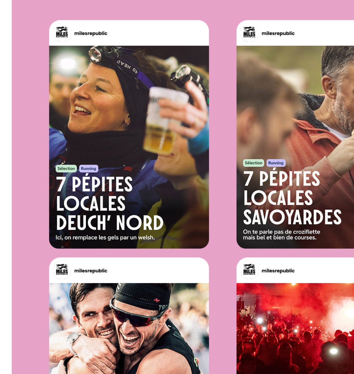 Création de campagnes digitales et développement de la direction artistique de Miles Republic, plateforme de vente de dossards qui met en avant la beauté des courses plutôt que la performance. L’objectif : pousser plus loin la vision de la marque en valorisant les bénévoles, le local et tout ce qu’on ne voit pas d’ordinaire dans l’univers du running. Création et déclinaisons d'assets et concepts graphiques pour pousser la vision de la marque.